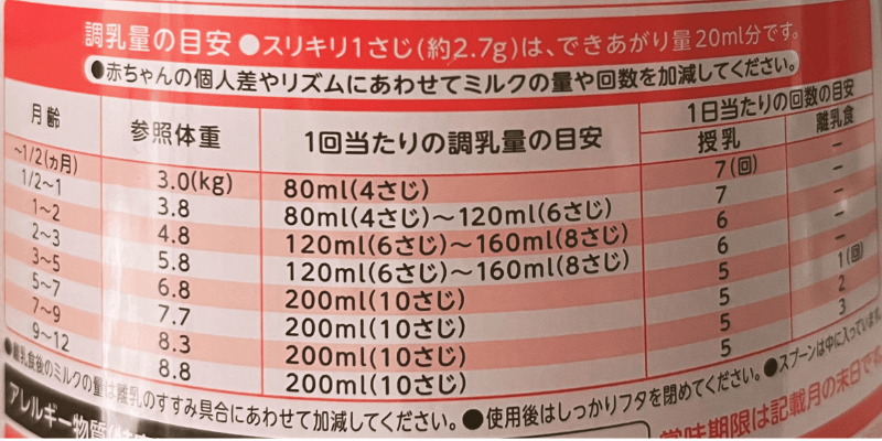 ミルクの容器にこのような表が載っていると思います。